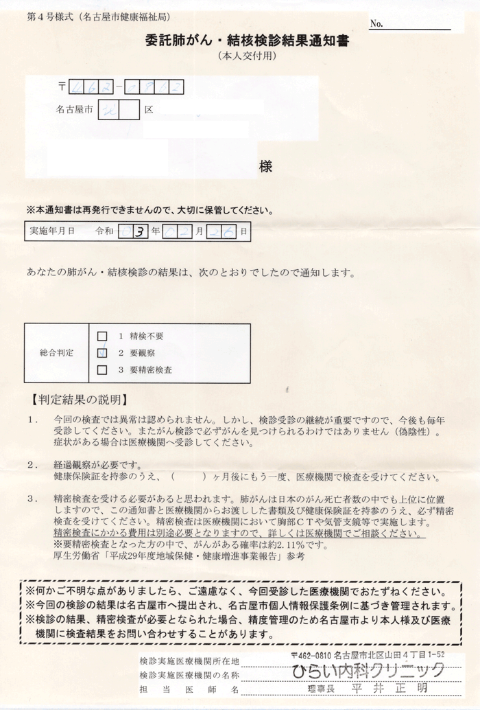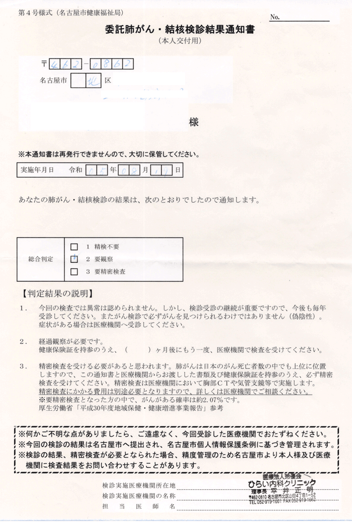 以下の検診結果通知書は名古屋市健康福祉局から提示されたもので、肺がんと胃がんの略式検査結果が記載されているようで令和3年と5年のものである。